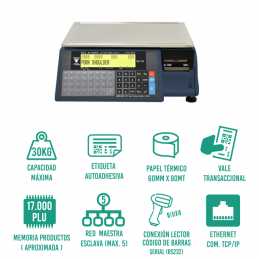 Balanza de gama alta con impresor para Vales y/o etiquetas, visor cliente a color, capacidad 30 Kgs.